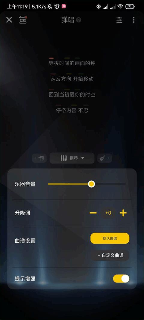 在调音界面我们可以看见曲谱设置里有这首歌曲默认的曲谱,也可以让我们自己自定义曲谱,毋庸置疑我们这个时候该点击自定义曲谱了。