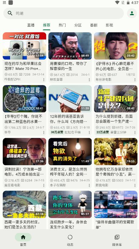 1.请在本站下载安装并打开PiliPlus,首页上方主要有着直播、推荐、热门、分区、番剧、影视等不同的板块内容。
