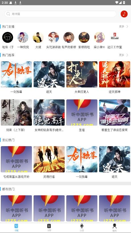 1.打开听中国听书app后,点击底部中间的“书城”,就可以看到听书资源了;