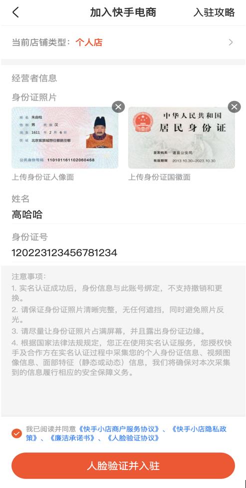 上传身份证正反面,等待姓名和证件号码填充完毕后,检验其正确性,确认无误后勾选协议(此协议和达人协议有区别),点击人脸验证并入驻按钮,经过本人扫脸成功后,即入驻成功