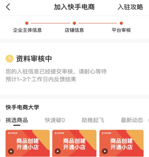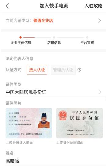 移动端目前仅支持普通企业店入驻(其他类型可通过电脑端访问快手电商官网入驻),需填写企业主体信息、店铺信息,后经平台审核,通过则入驻成功