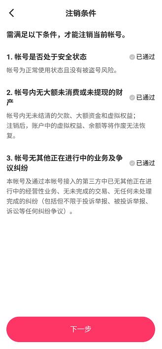 5、点击后会有许多的账号注销注意事项以及账号注销条件,在满足所有条件的情况点击下一步;