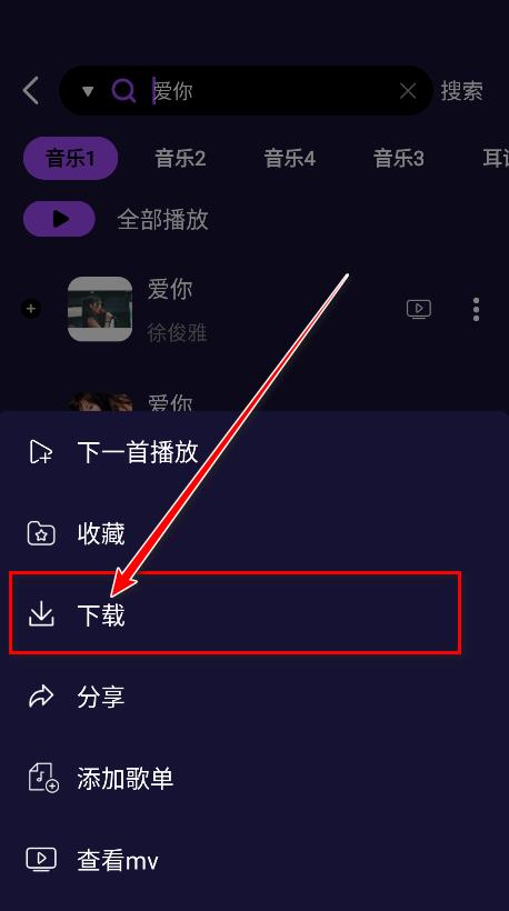 3.可以看到就会显示支持下一首播放、收藏、下载、分享、添加歌单、查看mv等功能,想用哪个就直接点击哪个就好。比如小编点击下载。