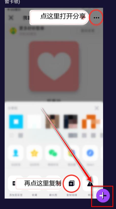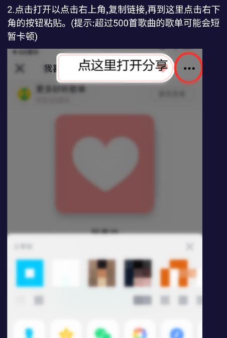 4.点击打开以点击右上角,复制链接,再到这里点击右下角的按钮粘贴。(提示:超过500首歌曲的歌单可能会短暂卡顿)