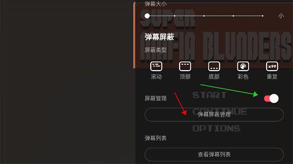 2、在右侧弹出的弹幕设置页面中,开启弹幕屏幕管理(下图绿色箭头所指),并点击【弹幕屏蔽管理】(下图红色箭头所指)