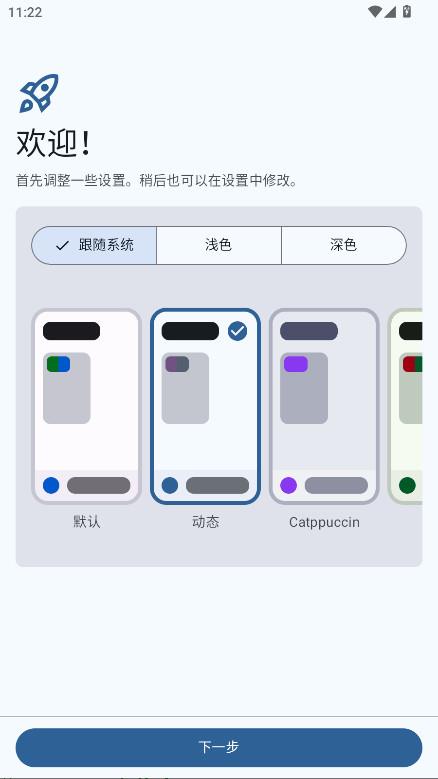 1、在本站下载安装完成后,初次进入软件需要进行一些基本设置选择一款你喜欢的主题,然后点击下一步