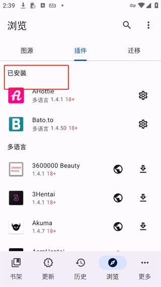 Mihon本身并不提供漫画,而是通过安装插件的方式从不同图源获取漫画,因此我们需要先安装插件,