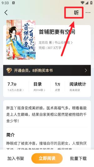 3、在书籍详情页点击"听"按钮就可以进入开启听书体验。