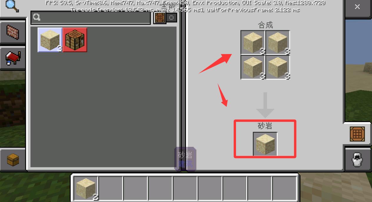 2、放入刚刚捡回来的方块进行合成会得到砂岩。