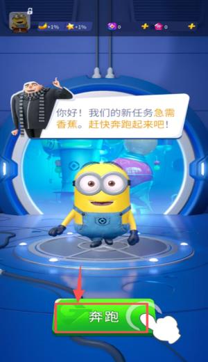 2、进入剧情界面后,查看任务提示信息,点击下方的 “奔跑” 按钮,开启小黄人的收集香蕉关卡。