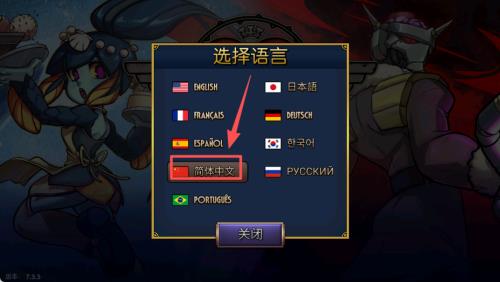 奇迹少女骷髅女孩游戏基础操作与玩法指引1. 进入游戏后,在语言选择界面中,可选中“简体中文”选项来切换为中文显示,完成选择后点击“关闭”即可进入游戏。
