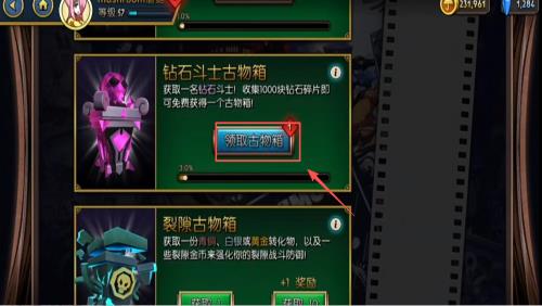 3. 在古物箱界面,点击“领取古物箱”按钮,可获取对应古物箱奖励,不同古物箱会提供不同类型的道具或角色资源。