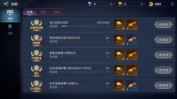 5、游戏内还设有荣耀、历练、目标三大成就系统,达成相应条件即可领取黄钻、卷轴等丰厚奖励。