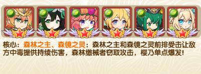 核心:森林之主、森镜之灵;森林之主和森镜之灵前排受击让敌方中毒提供持续伤害,森林缴械者窃取攻击,樱乃单点爆发!