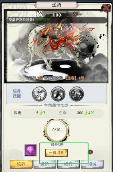 玩家可消耗坐骑培养丹提升培养经验,升级可为坐骑以及主角增加大量属性。