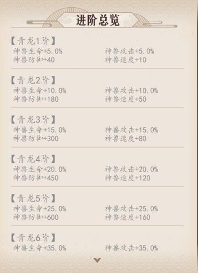 3、神兽每10级可进阶1次,进阶消耗相应系别英雄及神兽碎片,神兽碎片可以在神兽神殿对应的种族圣殿中通过或扫荡获得。进阶后额外提升神兽百分比属性。