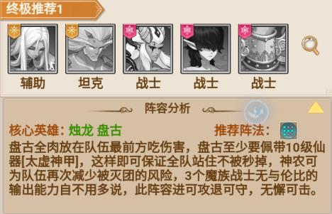 特点:盘古(带 10 级仙器)前排承伤,魔族战士提供高额输出,神农补充续航,攻防兼备,属于 “进可攻退可守” 的全能阵容。