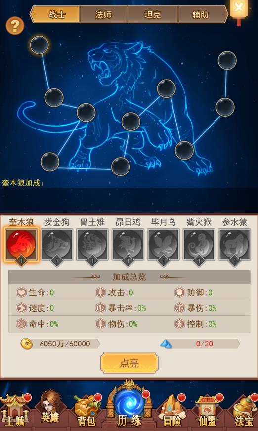 战士、法师、坦克、辅助4个职业对应着4张不同的星宿图,每一张星宿图只对应职业加成有帮助,而升级星宿图的材料是迷雾之尘,迷雾之尘需要击杀成功每一关卡后才能领取,从而用来升级星宿图。