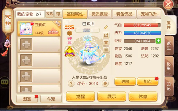 2、除了讨喜的外表,【白素贞】还拥有「碧落黄泉」、「高级审判」、「超级迅捷」、「水漫金山」和「超级法术连击」这些初始技能。其中最主要的就是「碧落黄泉」。
