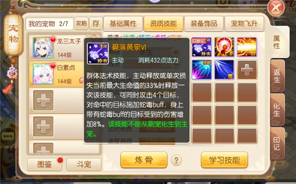 3、「碧落黄泉」是群体法术攻击的主动技能(白素贞首次释放碧落黄泉后本局单次每损失气血上限33%的气血额外释放一次该技能),可同时攻击2个目标,对命中的目标施加碧落黄泉buff,身上带有碧落黄泉buff的目标受到的伤害增加3%,持续3回合,不可叠加,可驱散,死亡后不消失,该技能单回合内至多触发3次。该技能不能从副宠化生到主宠。