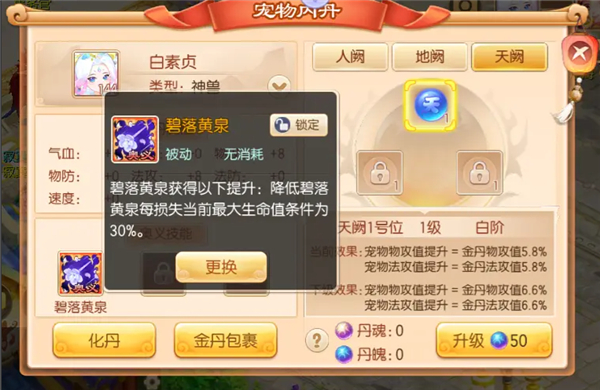 4、在神兽进阶之后,技能的伤害系数将会得到提升,增伤比例也会提升,技能攻击目标数量还会得到增加。「碧落黄泉」技能奥义:降低碧落黄泉每损失当前最大生命值条件为30%。