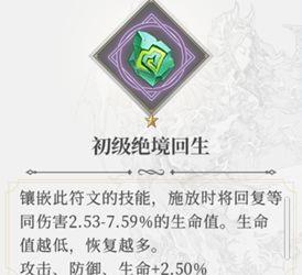 5、绝境回生符文:初级为紫色,中级为橙色。生命值越低,恢复越多。这个符文放在任何伤害阵容都能增加生存概率,狂战的特性和这个符文也非常的契合,很适合PVP时使用。