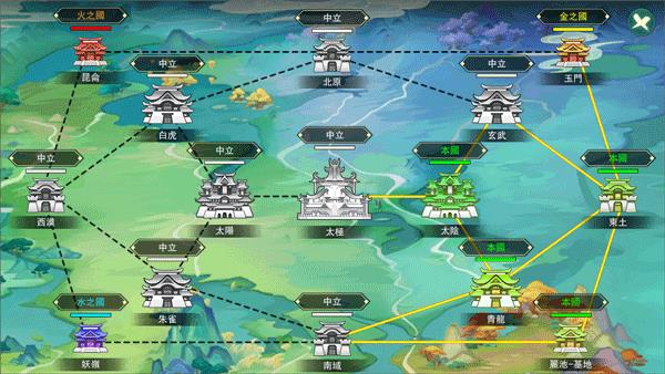 版图是国家玩法中的核心PVE内容。各服务器从基地出发,逐步挑战相邻区域副本以获取积分,争夺区域归属权,也可进攻已被其他国家占领的区域以扩张领土。