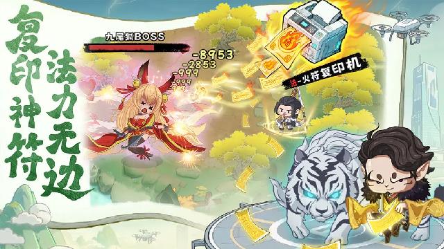 3、游戏加载完成后,进入战斗场景,玩家可操控角色与九尾狐BOSS展开对战。通过释放技能(如“火符复印机”)攻击敌人,同时收集掉落的神符提升战斗力。