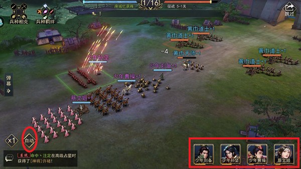 6、技能:在战斗过程中,武将的怒气值会提升,当武将头像发亮时即可点击释放武将技能,也可以点击左下角自动,武将就会自动释放技能