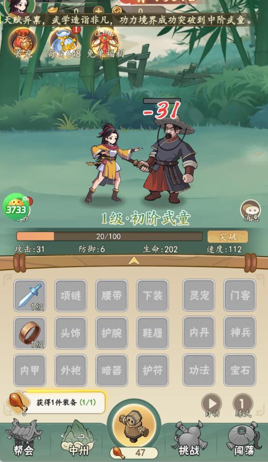 开局先穿戴基础装备,完成主线任务,解锁属性加成提升战力。