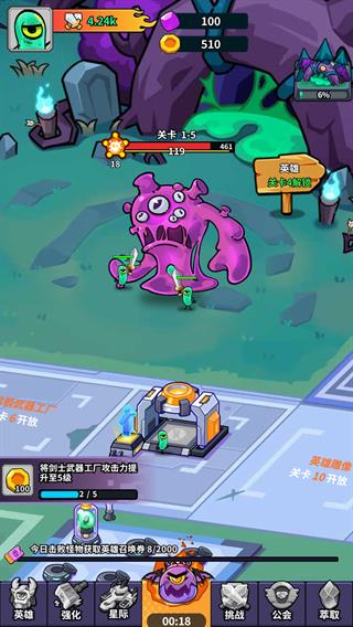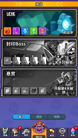 利用放置挂机功能,离线也能持续获取资源和英雄召唤券,解放双手。