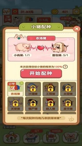 4、将不同造型的小猪交配后可以获取全新造型的小猪,不断饲养更多小猪不断获取更多奖励吧。