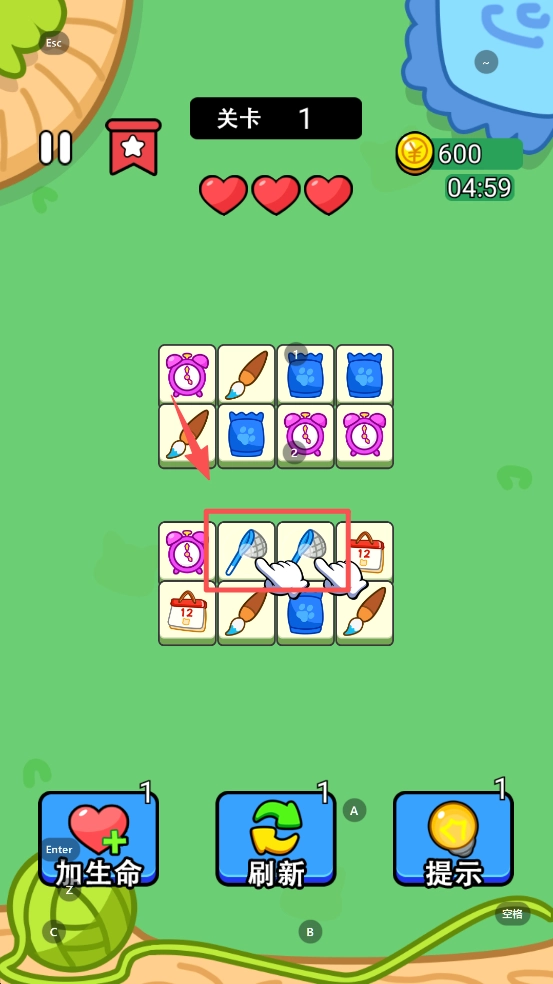 2、在游戏中,找到并点击相同的图案进行消除,完成关卡目标。