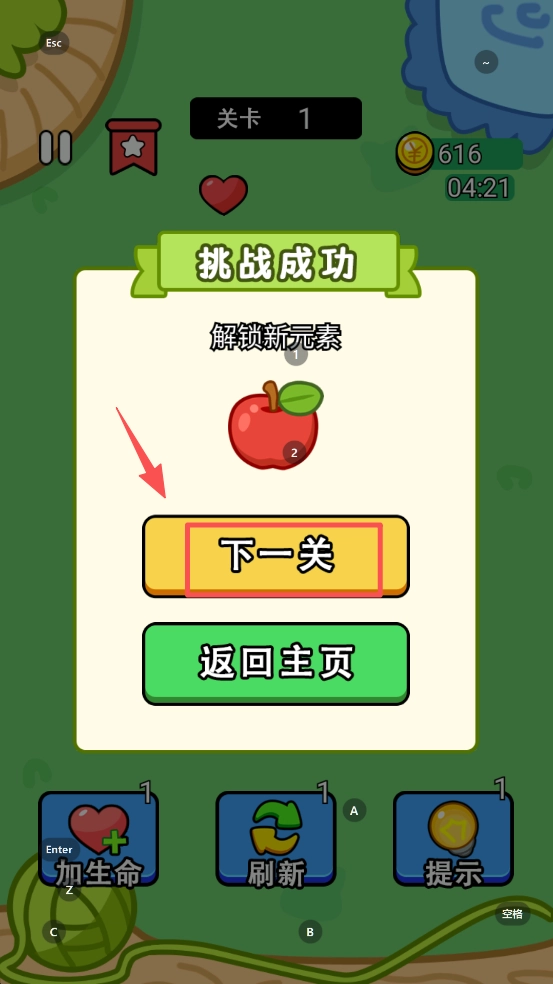 4、挑战成功后,点击“下一关”按钮,解锁并进入下一关卡继续游戏。