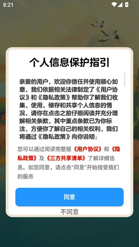 顺心如意游戏红包官方正版攻略-新手教程1、打开游戏,游戏会弹出相应的个人信息保护指引。